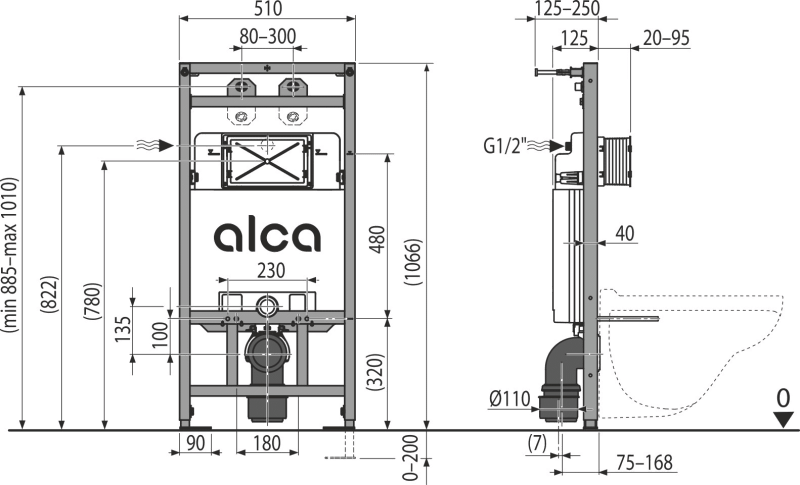 - Pre závesnú výlevku s rozstupom kotviacich skrutiek až do 420 mm a odpadom Ø90/110 mm