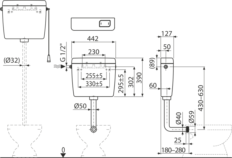 - Splachovací set pre vysoko položenú nádržku (šnúrka, držadlo, páka)