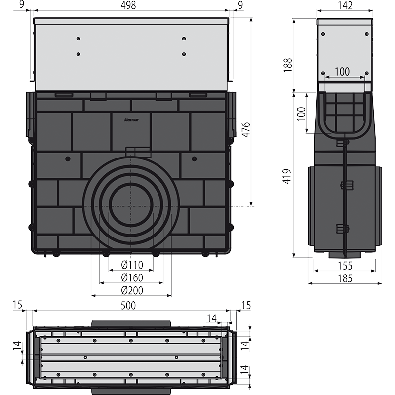 - Bočné napojenie na odpad Ø110, 160, 200 mm